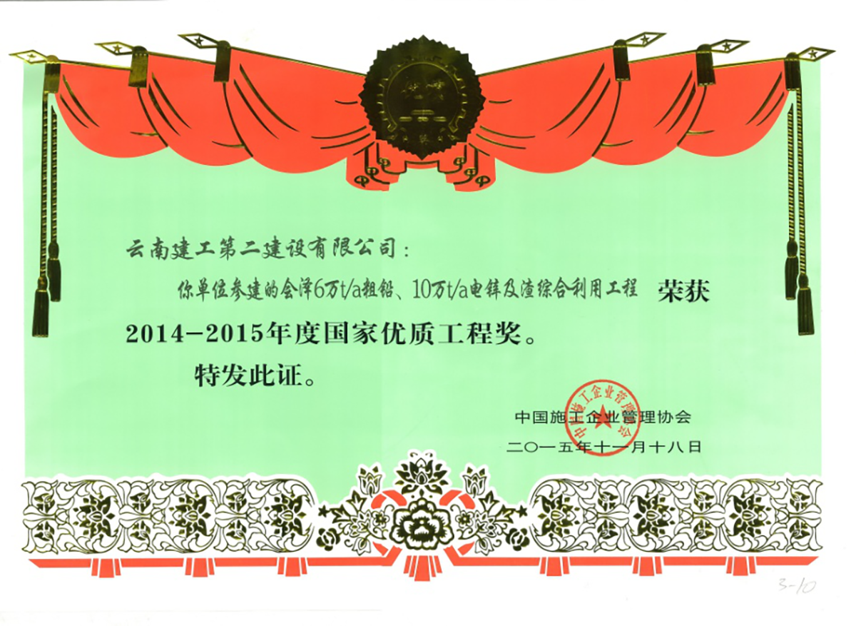 9 | 云南馳宏鋅鍺股份有限公司20萬噸/年鉛鋅資源綜合利用環(huán)保節(jié)能選冶技改項(xiàng)目 | 國家工程建設(shè)質(zhì)量獎(jiǎng)審定委員會(huì) | 2007 | |