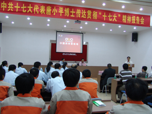 2007年11月14日下午3時(shí),中共十七大代表唐小平博士前來我司宣講十七大精神,活動在廣州市國研機(jī)械設(shè)備制造有限公司大會議廳舉行,參加大會的有廣州市天河區(qū)組織部、宣傳部領(lǐng)導(dǎo)、珠吉街道黨工委的領(lǐng)導(dǎo)同志們以及我司全體員工,廣東電視臺、廣州日報(bào)等多家媒體派記者前來報(bào)道。大會由國研副總經(jīng)理、黨支部書記王聲躍主持, 國研董事長、總經(jīng)理王聲位作了熱情洋溢的講話,介紹了國研機(jī)械的發(fā)展規(guī)劃以及黨支部的建設(shè)情況。