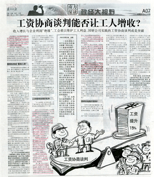 7月14日,《南方日報》以《工資協(xié)商談判能否讓工人增收?——國研公司實踐的工資協(xié)商談判或是突破》為題,用三分之二大版篇幅報道廣州市國研機械設(shè)備制造有限公司實踐工資集體協(xié)商的成功經(jīng)驗。