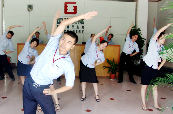 每天早上8:30,隨著公司團(tuán)支部書記李運(yùn)喜一聲哨響,健身活動正式開始!全體員工迅速集合,不到兩分鐘,就在健身場地排起了整齊的隊(duì)伍,一個(gè)個(gè)精神抖擻、神采奕奕。體育專業(yè)出身的團(tuán)員青年朱承容,站到隊(duì)伍前列給大家當(dāng)教練。公司高管帶頭參與,大家整齊劃一練起來?!暗谝还?jié),頭部運(yùn)動,一二三四五六七八…… “教練”認(rèn)真,“學(xué)員”用心,整個(gè)健身場面生動、氣氛活潑、積極向上。