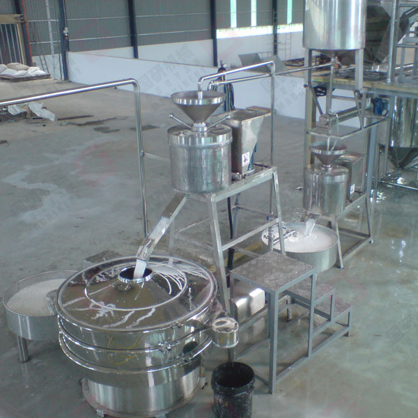 大米→射流提升→除砂→洗米、浸米→濾水→磨漿→壓濾脫水→碎粉→高溫攪拌→擠片→擠絲→蒸熟→老化→切斷→松絲→洗粉→濾水→定量→干燥→成品