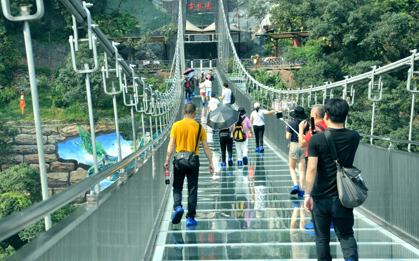 兩小時的小北江之游,大家都還余味未盡。導(dǎo)游又帶上大家趕往這次團建活動的重頭戲的目的地:古龍峽的“云天波霸”。今天公司參加團建的所有員工都要挑戰(zhàn)目前世界上較寬的高空玻璃橋,玻璃橋像一條通體透明的巨龍連接著峽谷兩岸,橋下懸空超過100米,站在橋上向下看,真是令人心驚膽戰(zhàn),大家相互鼓勵,三三兩兩牽手前行,用相互的關(guān)愛順利通過并成功抵達(dá)世界較大直徑的懸空玻璃平臺。盡管大家都汗流浹背,但每個人臉上都洋溢著喜悅。因為此時大家都收獲了克服恐懼心理后戰(zhàn)勝困難的勇氣和成功!