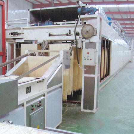 原料提升—投粉—混合計量給水—和面—熟化輸送—一次壓延—面片熟化—連續(xù)壓片—切絲定長—給桿—掛桿上架—剪齊—烘房烘干—下架—定長切—包裝